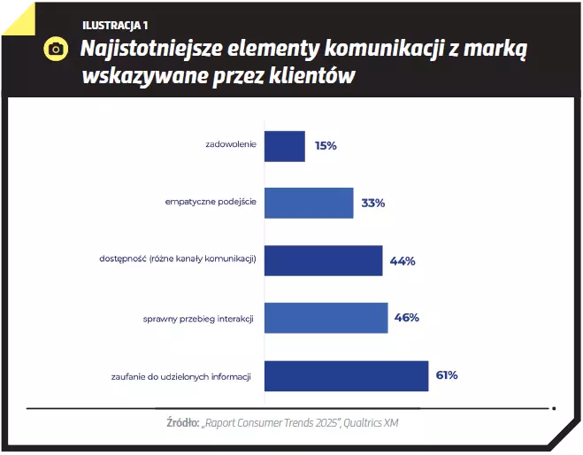 Konsumenci chętniej wybierają marki, których komunikacja jest jasna, szczera i spójna w trakcie całej podróży klienta – od wizyty na stronie internetowej po kontakt z działem reklamacji. Według wspomnianego już raportu „Consumer Trends 2025” wśród najważniejszych elementów interakcji z marką wskazywanych przez konsumentów znajdują się: zaufanie do udzielonych informacji, sprawny przebieg interakcji oraz dostępność w różnych kanałach komunikacji.