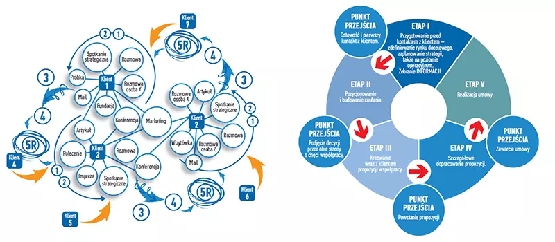 Cyfry 1 i 2 symbolizują etapy „Przygotowanie” oraz „Pozycjonowanie i budowanie zaufania”, „kółko” z 3 – to etap, w którym klient tworzy ofertę, 4 – to dopracowywanie szczegółów kontraktu. I wreszcie 5 – kółko symbolizujące realizację kontraktu (jest ono powiększone, gdyż jest to symbol dawania klientowi zawsze więcej niż w kontrakcie). Mała strzałka odchodząca od tego kółka oznacza powrót klienta po zakończonym kontrakcie „do puli klientów oddziałujących na siebie”. Klienci z numerami 4, 5, 6 i 7 to ci, którzy pojawią się… nie wiadomo skąd! Taka jest natura V Generacji.